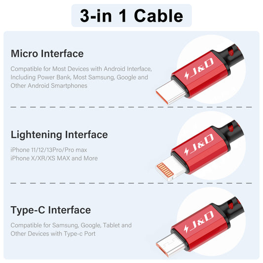 3-in-1 Multi Charging USB Cable Cord with Type-C/Micro USB/Lightning Port, 1.2 m