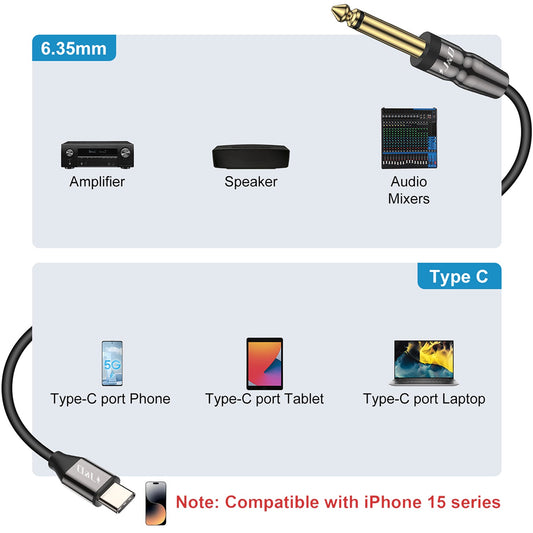 J&D USB Type C to 6.35mm 1/4 Inch TS Audio Mono Aux Adapter Cable