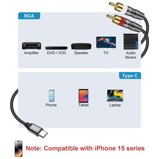 J&D USB Type C to 2 RCA Cable - USB Type-C to 2RCA Male Audio Splitter