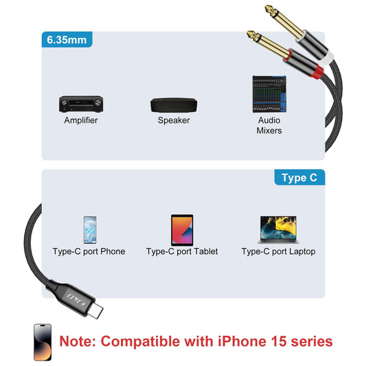 J&D USB Type C to Dual 6.35mm Stereo Splitter Y Cable - 1/4 Inch TS Audio