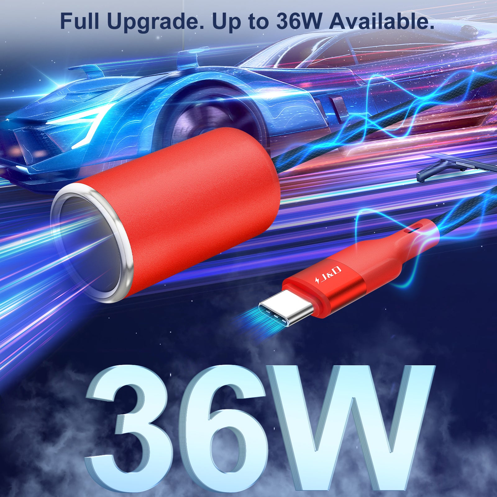 J&D USB-C to 12V Car Socket Adapter, 36W PD, for Dash Cam, GPS, Red