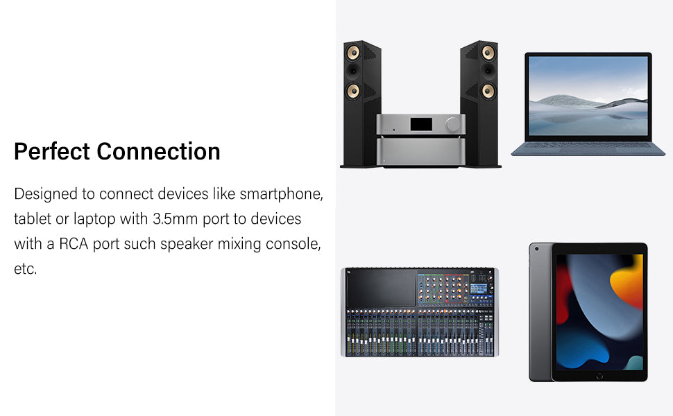 - Composition: 3.5mm Female connector on one end and 2 Male RCA connectors on the other end